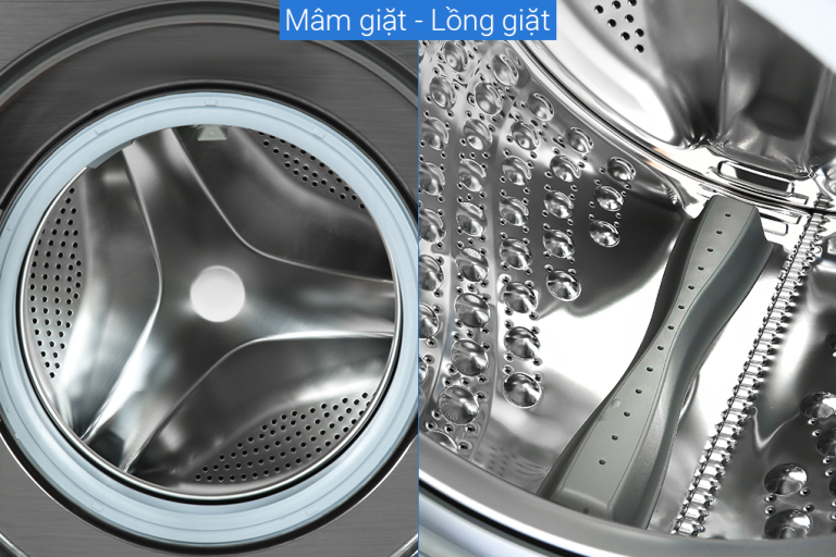 – Lồng giặt được hoàn thiện bằng chất liệu thép không gỉ cho hiệu quả bền bỉ và hạn chế vi khuẩn, chất liệu này thường được sử dụng trong các vật dụng chế biến thức ăn.