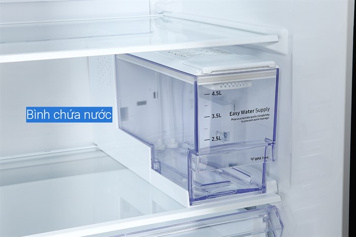 Khay lấy nước cũng được tích hợp trên cửa tủ giúp người dùng có thể lấy nước lạnh nhanh chóng, tiện lợi. Thiết kế này cũng góp phần hạn chế mở cửa tủ thường xuyên gây thất thoát hơi lạnh giúp tiết kiệm được điện năng sử dụng của sản phẩm.